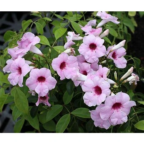 Pianta rampicante sempreverde, originaria dell’Australia e della Malesia; ha crescita vigorosa, e si sviluppa rapidamente fino ad un’altezza di 4-5 metri; i fusti sono sottili e molto ramificati, di colore verde brillante, tendono a lignificare alla base. Le foglie sono imparipennate, costituite da 5-7 piccole foglie lanceolate, abbastanza spesse e cuoiose, di colore verde scuro. Dalla primavera inoltrata fino a fine estate producono numerosi fiori a forma campanulata, con corolla allargata, che presenta cinque lobi; i fiori sono di colore rosa chiaro, con gola fucsia, ed emanano un delicato profumo, esistono anche varietà con fiore bianco candido. Ai fiori seguono piccoli frutti ovali, che liberano in autunno moltissimi semi scuri. P. andorrana ha fiori più piccoli, riuniti in grappoli, di colore rosa, bianco