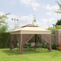 Outsunny Gazebo Da Giardino Con Doppio Tetto E Zanzariera In Poliestere, Caffè, 2.9×3.9m