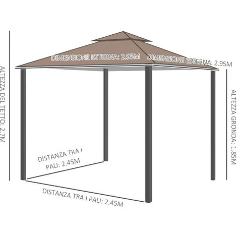 - • Distanza tra i pali (area calpestabile): 245L x 245Pcm