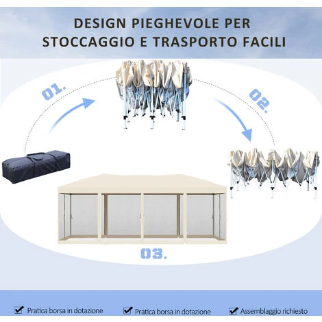 Goditi l’estate all’aperto con questo fantastico gazebo Outsunny. 6 pareti con zanzariera rimovibili. Il resistente tetto in polietilene protegge dal calore e dalla pioggia. Porta principale con chiusura a cerniera. Le pareti laterali possono essere collegate tramite velcro. Telaio in acciaio antiruggine, facile da aprire e chiudere. Include una borsa per il trasporto.